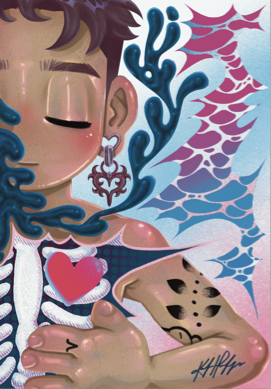 Kailyn Humphreys is a trans Winnipeg-born artist residing in Mohkintsis. His work delves into personal struggles about identity, sexuality, relationships, and change through the use of bright and cute illustrations to create a fantasy world of appreciation for the hard conversations.