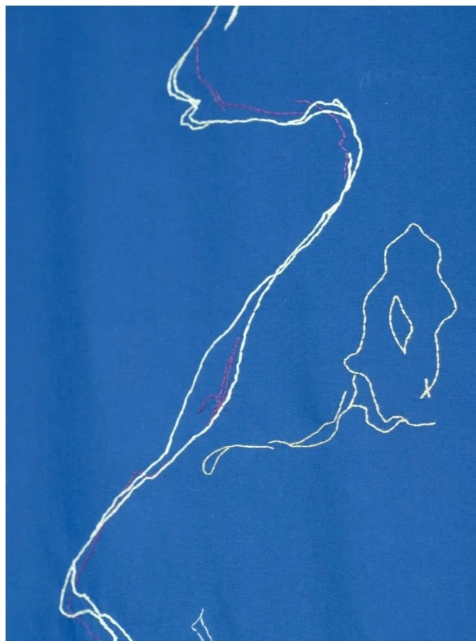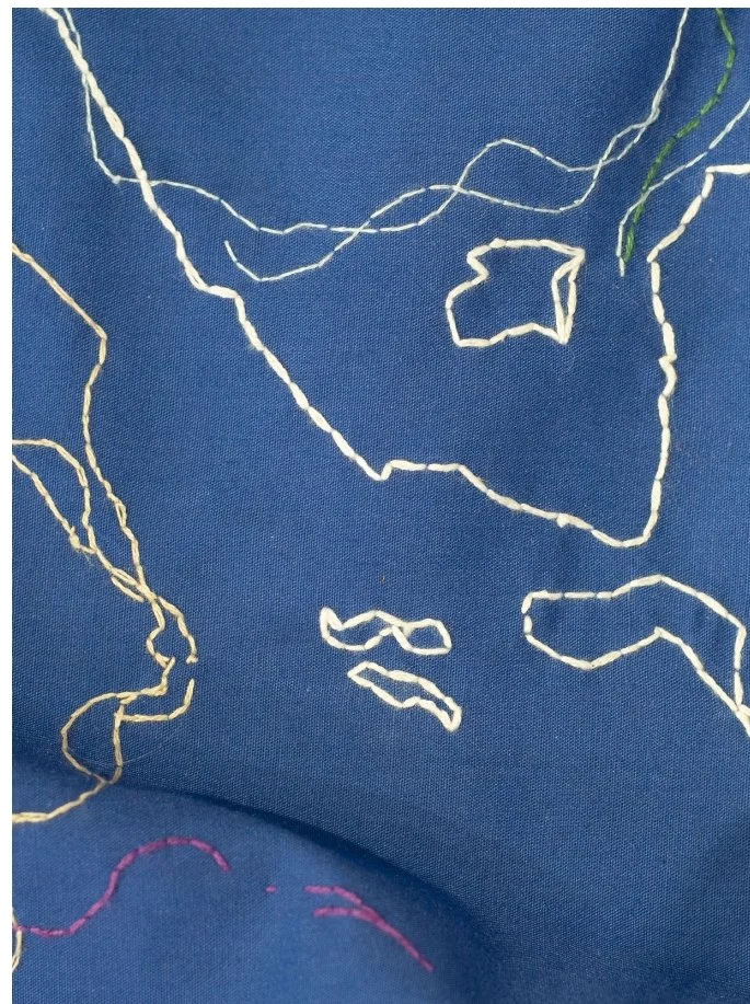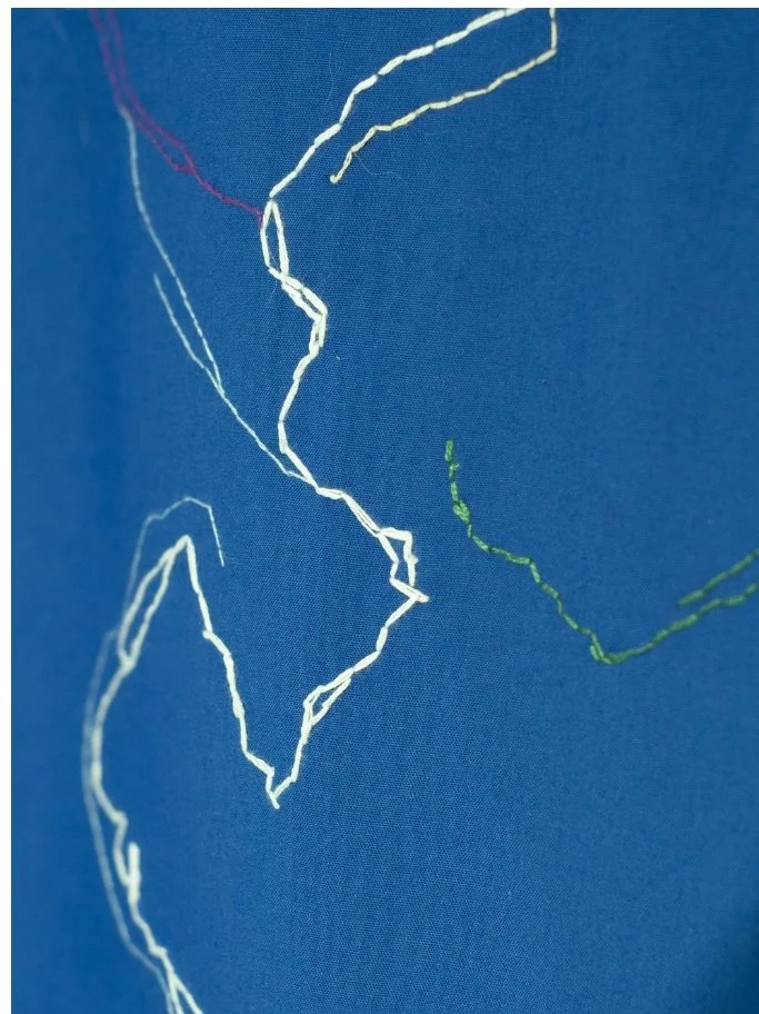 Emerging from a reaction to stress and isolation during the pandemic alongside a renewed reliance on the healing capabilities of being out in nature, this work is part record of time, part appreciation for the waterways that sustain life in the Bow Valley, and part comfort blanket. The Source is a depiction of the Bow River from its source at Bow Glacier along its pathways and tributaries, past my home in Banff, and out towards the foothills. It is a personal map of the river, my experiences of a childhood and life spent on its waters, and a record of the pandemic. Embroidering the 20 feet of fabric became a testament to the solitary time spent during isolation and afterwards. A record of anxiety and social isolation while also being a coping mechanism. Focusing on the river, its changes and its stability, during daily walks and at home while working the project, provided comfort and a link to others, to the Clematis Collective and to our surrounding ecosystems. It became a reason to go outside and a comforting blanket-project inside. The Source, both the river it represents, and the creation of the artwork, became my source of support and stability. It is a length of fabric that records the time spent alone, while also being a record of time spent reconnecting with nature, and a record of reaching out to others.
