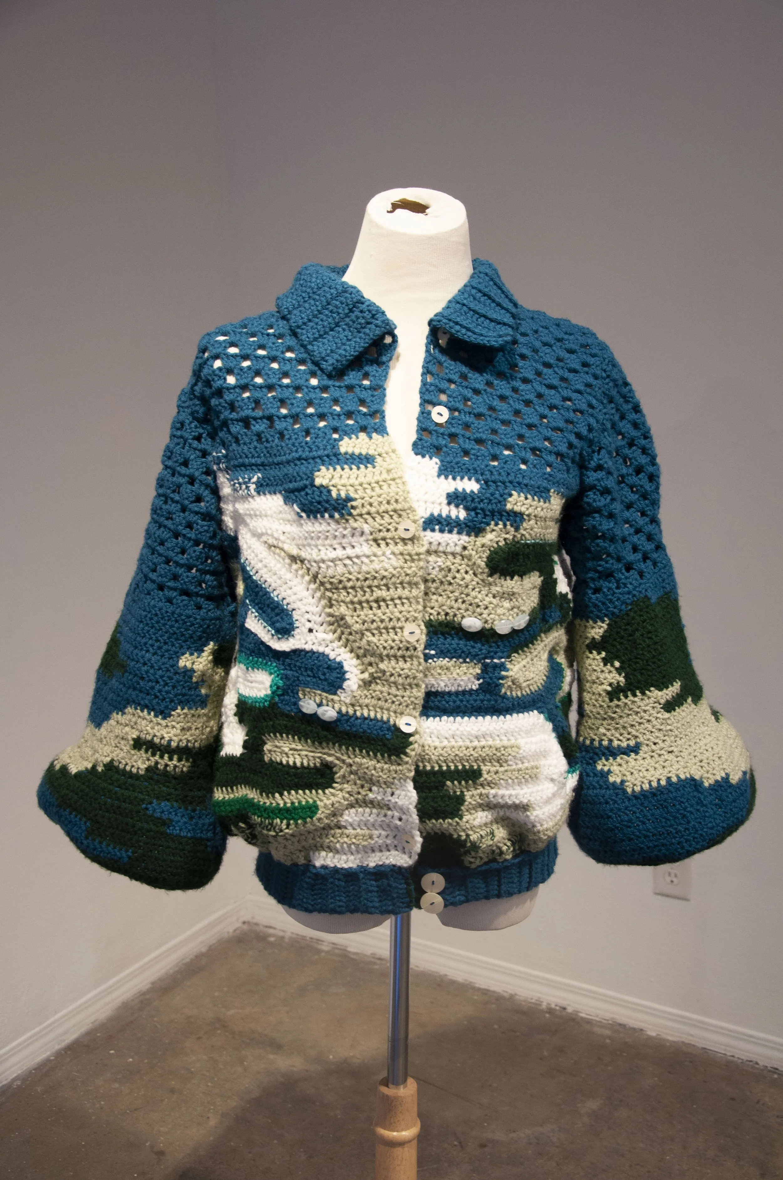 A sweater for camouflage, a sweater for fashion, a completely silly addition to your outdoor wardrobe. The body of the sweater was made by crocheting abstract ripple shapes that were then filled in between with contrasting colours and accessorized with embroidery and beads to create the impression of Elbow River reflecting a bright sunset through the dark water.