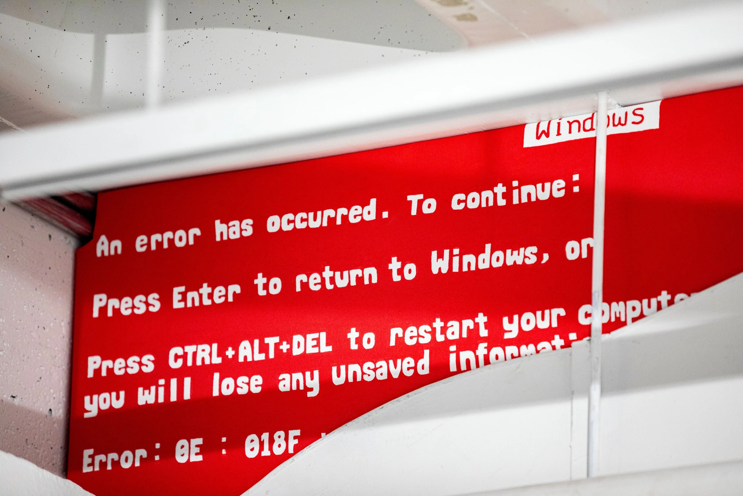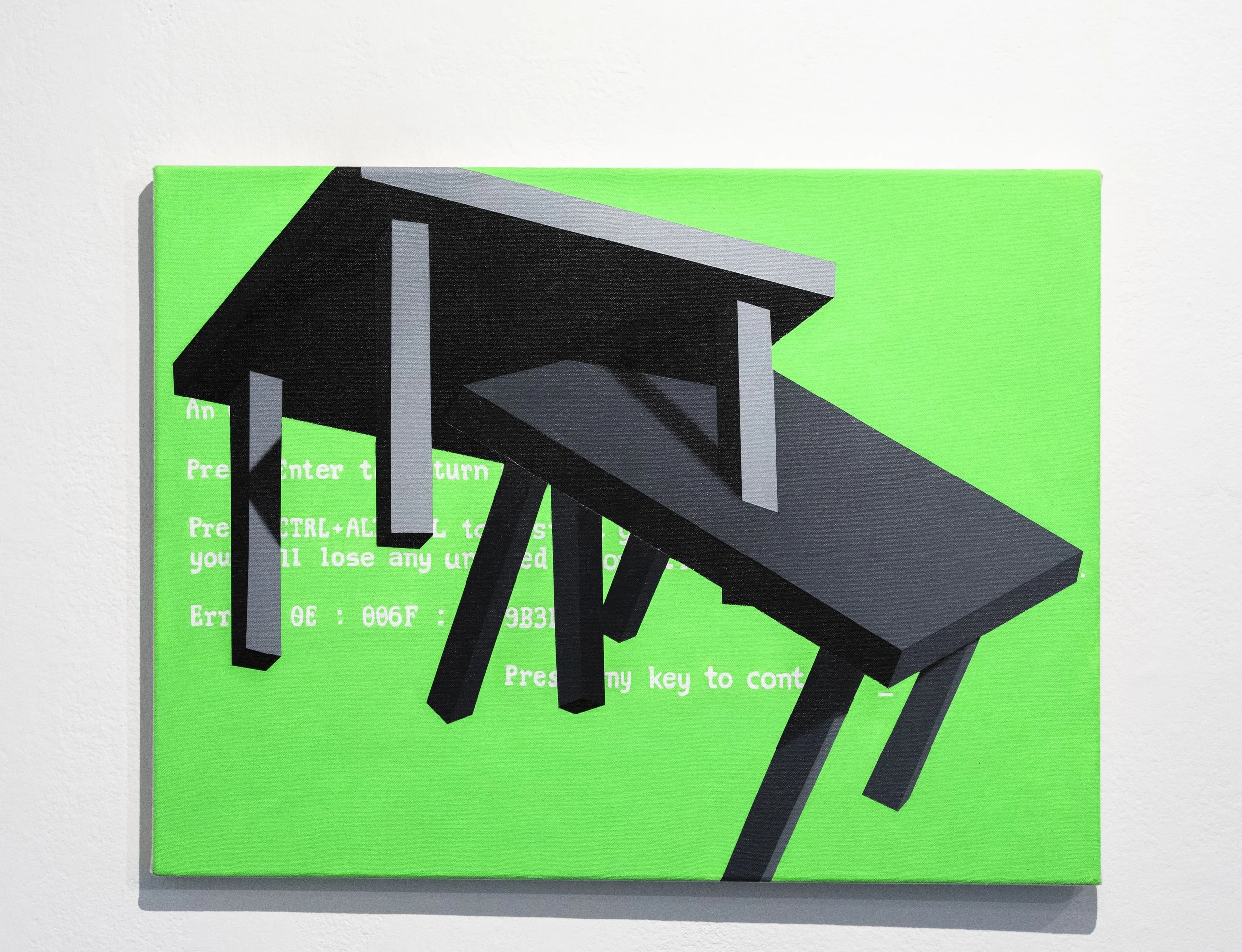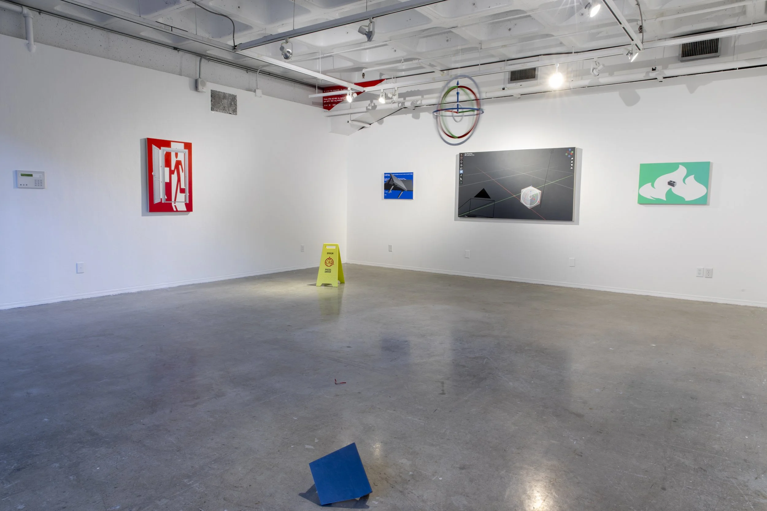 Interfaces dictate the conditions of your interaction with a more complex system. It acts as a mediator between the users and the machine. When these displays fail, there is no longer any meaningful interaction that can take place. The power of the user is lost. The user can only act within the parameters set out by the designer, and other potential uses beyond the intended functionality are discouraged. These digital interfaces are similar to institutional and industrial spaces. Symbols, signage, and text act as barriers and guides in these complex systems, dictating what is a space to linger in and where to move through. We become very passive participants in our environments. You are not bound by code here, but the ways to conduct yourself are conditional. With tech favouring simplicity, restriction, and profitability over experience, and with institutional spaces being designed with conformity in mind, a literacy of one's environment is needed to regain the user's power in these spaces. Interacting with spaces in a truly transformative manner disrupts the conditions in which they were designed. Maybe a chance for something new is hidden in broken code, error screens, behind ceiling tiles, in the flicker of an exit, and under coats of paint.