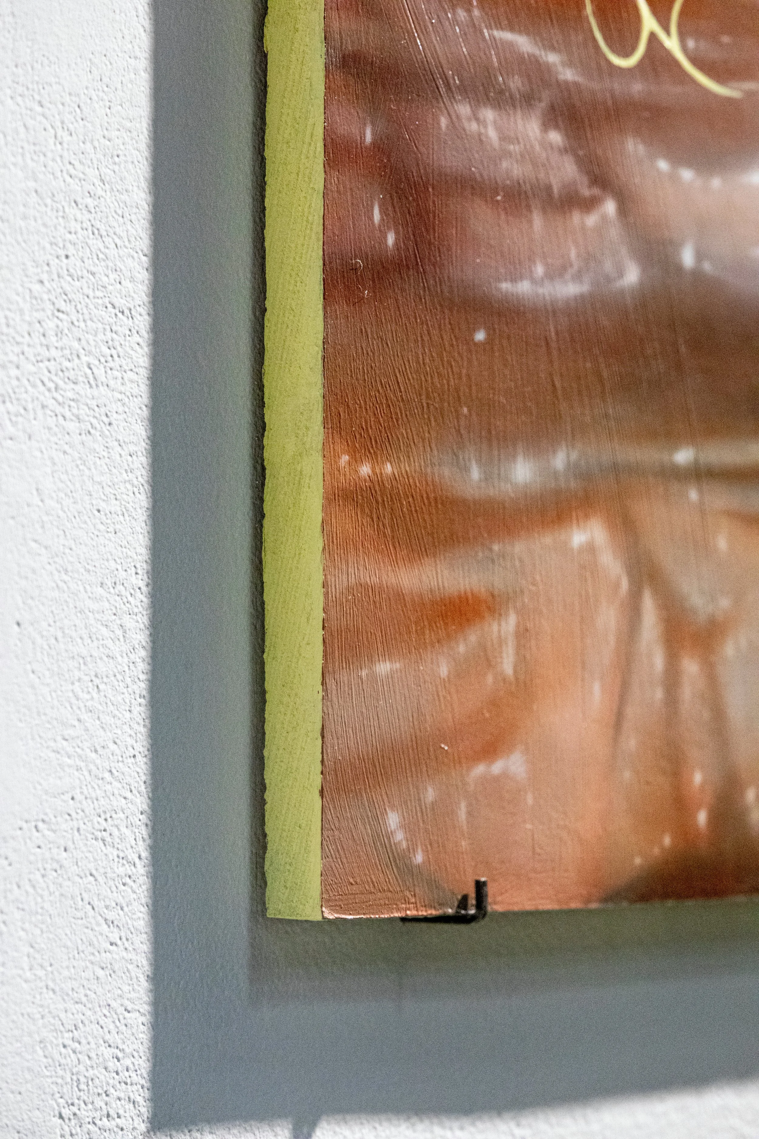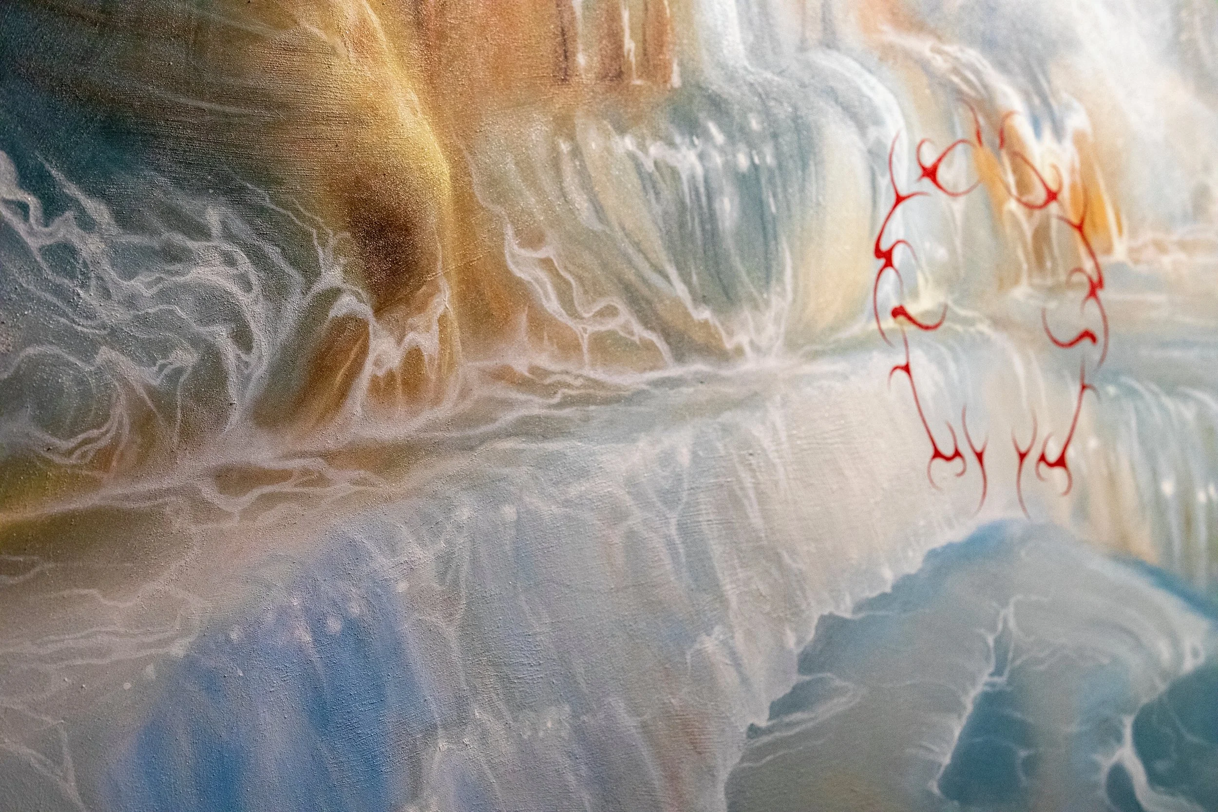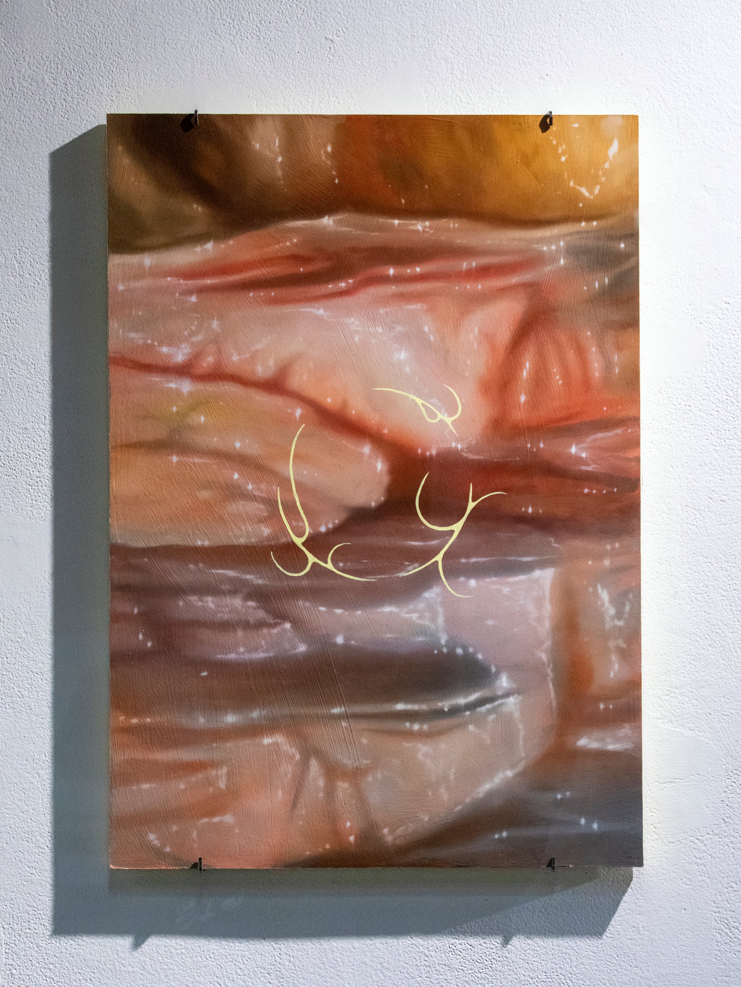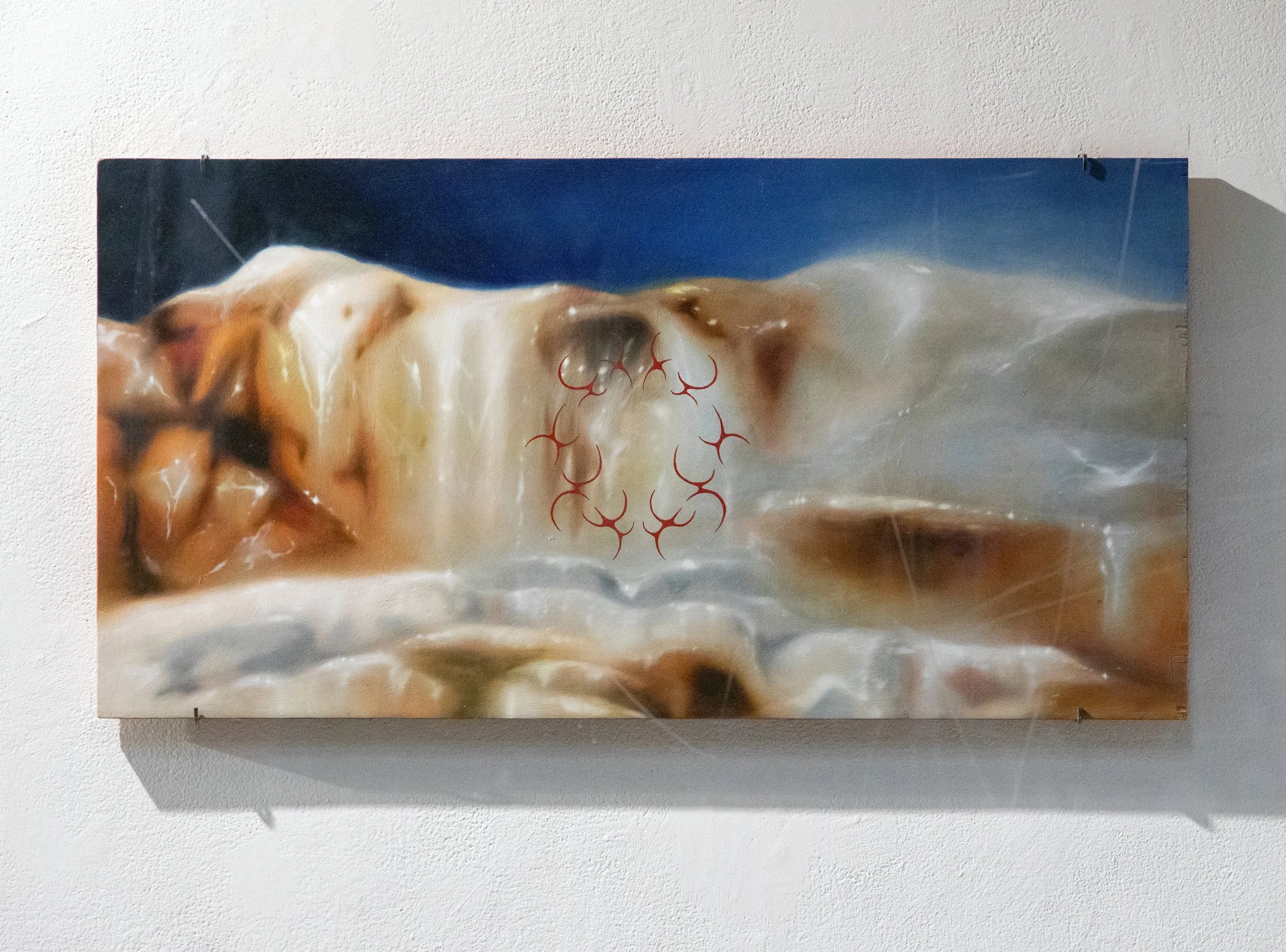 The artist is a mixed media painter with a focus on oil, while also utilizing digital tools and printing to represent forms of nostalgia. Through imagery of ethereal locations and somewhat familiar yet alien symbols the artist aims to make viewers yearn for something that is fading. Art practices used in the past like film photography, hand poke tattoos and historical painting are all incorporated into the sigils used by the artist, alluding to history while using new processes to place the work in a contemporary context. Photos taken by the artists grandfather influence some of the imagery and message of impermanence throughout the work. Places, people and ways of making art will never stay the same and there is beauty in the past and future.