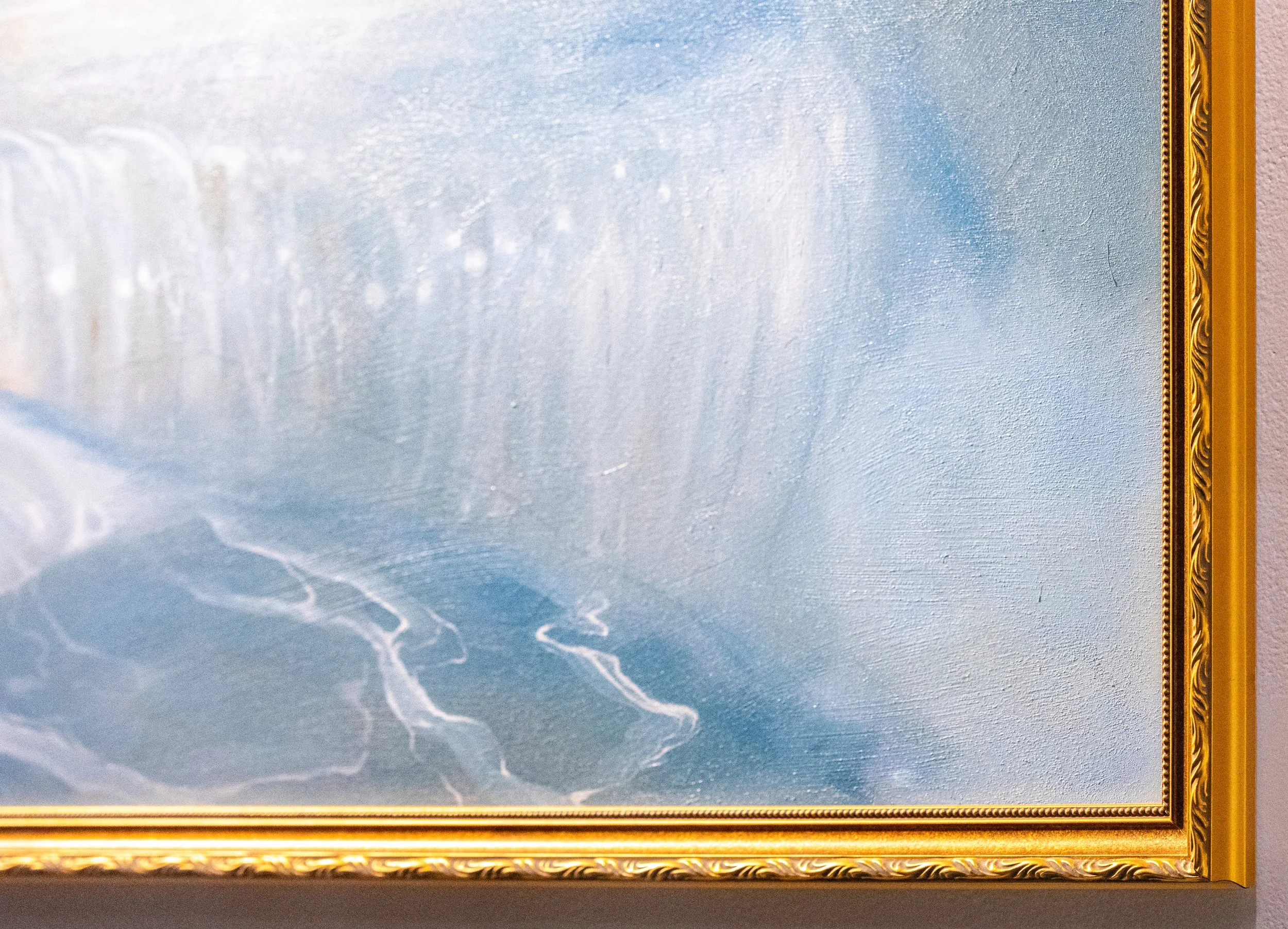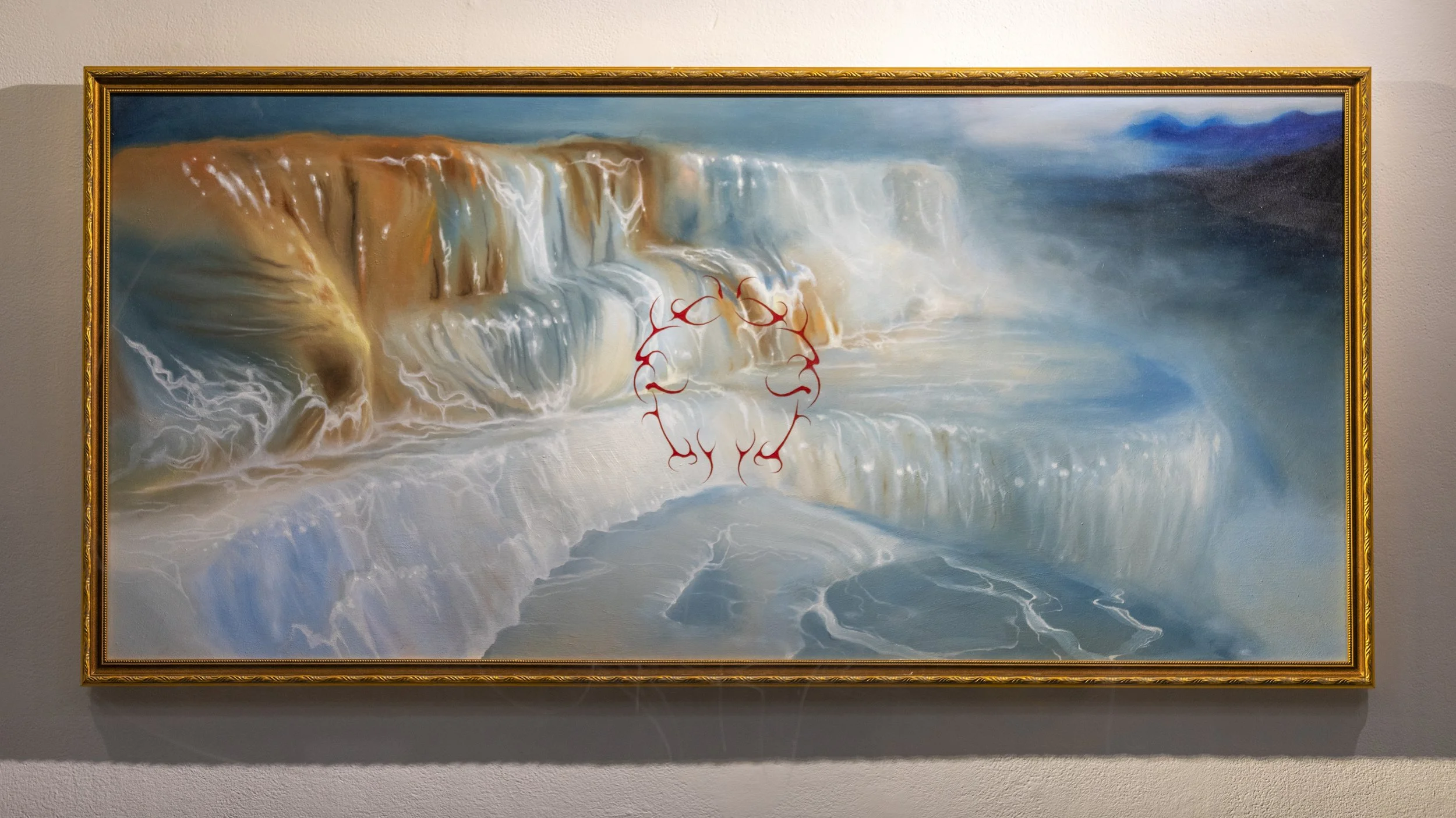 Landscape Sigilism is an exhibition that highlights nostalgia and isolation through painting and iconography. Art processes and personal history are key elements in executing this narrative. this grouping of work intends to make viewers feel contemplative and reminiscent. Conceptually the exhibition talks about the artists connection to the creative endeavours, specifically film photography, from their grandfather and other relatives. The exhibition also ties in the nostalgia and history of tattooing within the sigil designs present in the works. The sigils take design elements of retro tribal tattoos, and even call back to earlier imagery like the crown of thorns from a time when hand poking tattoos was common practice. A tattoo is a permanent yet aging reminder of a specific artwork and time period, and this alludes to the concept of nostalgia. Like aged ink in skin, or photo on paper, these memories fade with time. The paintings within the exhibition play into this quality by creating metaphysical atmospheres that allow space for contemplation. The exhibition is structured around a series of oil paintings that feature mineral waterfalls encased in sigils reminiscent of tattoos. The inspiration for these pieces comes from film photos the artist sourced through familial data banks, that were taken during the 1970s. Framing these falls are sigils that draw inspiration from camera lenses as well as retro tattoos. The paintings feel otherworldly but don’t include figures, allowing individuals to place themselves within the work. The artist is reminiscent of traditional ways of creating art, combining them into a singular creation meant to invoke memory. The falls are meant to take viewers to a liminal space somewhere in between dream and memory, and this connects to the other landscape piece that features an abandoned Alberta homestead. This piece is also meant to invoke a longing for once was and something that will never be again. The viewer is meant to feel a sense of limbo, acknowledging the past and the future. The main materials used in the exhibition are oil paint and scrap wood. Oil paint reminds audiences of a history of art within galleries while scrap wood talks to the reuse and new ways of finalizing a work of art. There are elements of tradition mixed with fresh ideas. Most of the wood is reused from the Alberta University of the Arts connecting the physical properties of the work to the building it’s being shown in. The final aspect of the exhibition is hand drawn and assembled zines that will be free to take. They showcase ambiguous f igures, nature, and tattoo designs tying in all of the elements of the exhibition. Because tattooing is part of the artists practice these zines also act as a form of dissemination and exposure when taken out of the gallery. Tattoos are a piece of art a person carries with them always, and because there are ties to this history throughout all the works, the zines work as a stand in for tattoos.