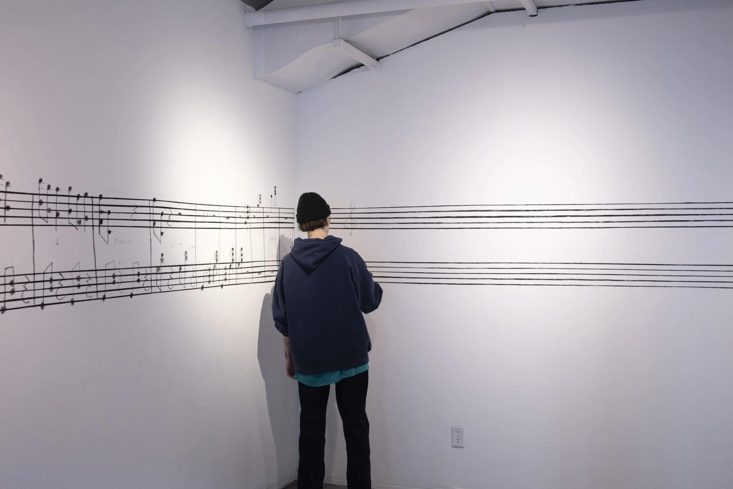 Scoring the MNG is a durational performance where a musical score is composed on a piano inside of the Marion Nicoll Gallery (MNG) as an exploration of translation and interpretation. The characteristics and architecture of the MNG guide the composition process, and the score is written directly onto the walls of the MNG throughout the duration of the exhibition. Compositional parameters are extracted from observations made in and around the gallery related to the language of music. For example: the MNG’s cubic/square shape might be represented through use of quartal harmony, four-note chords, shell chords (to create a sense of containment/spatiality), and avoiding the antithetical circle of fifths. The work becomes an ongoing process of attempting to translate one non-verbal language (architecture) into another (music) to underscore a relationship between the two.