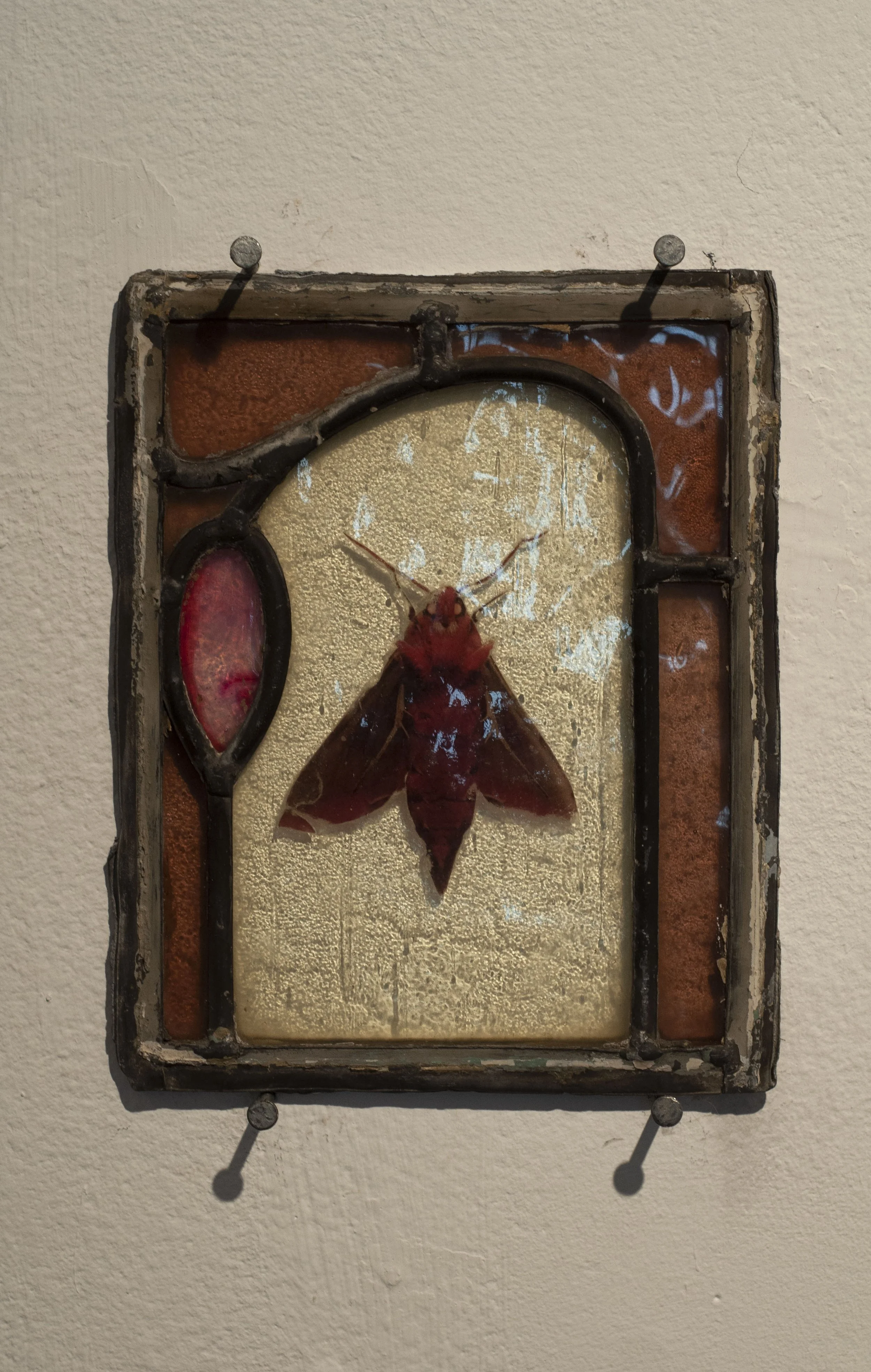triptych, 2022, found stained glass windows, image transfer collage (detail)