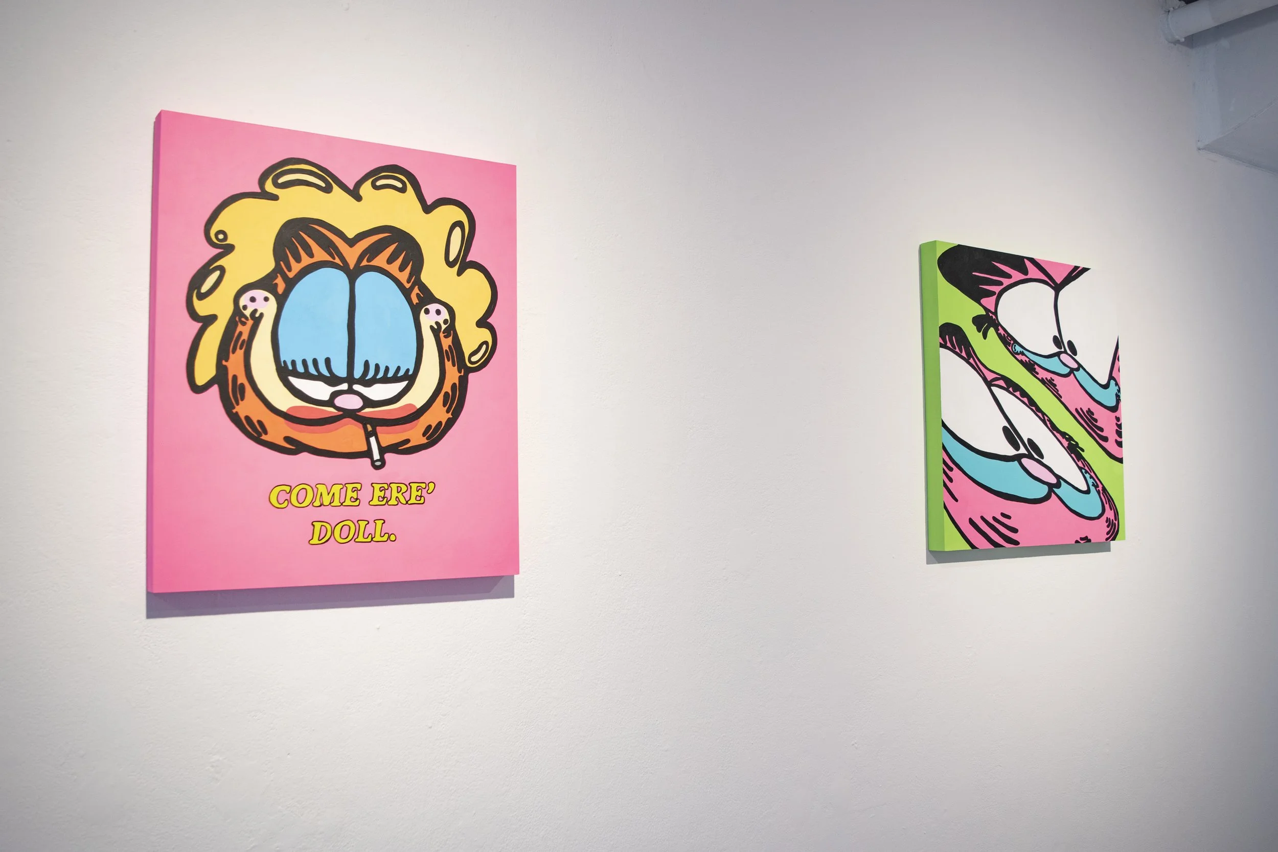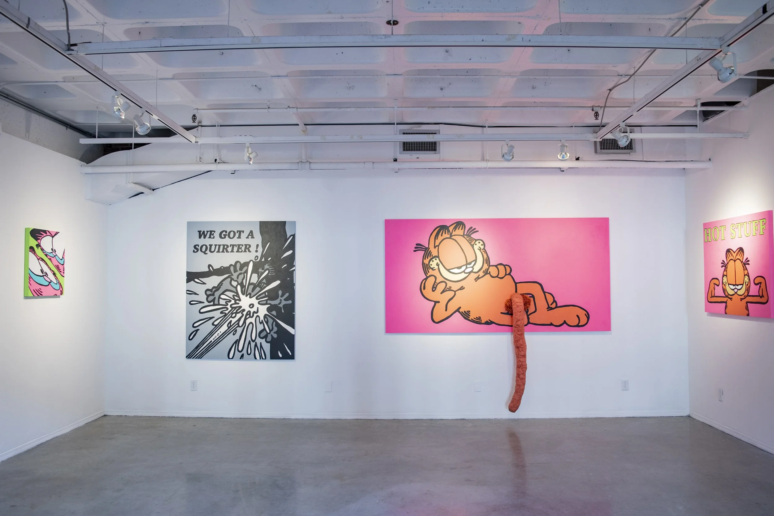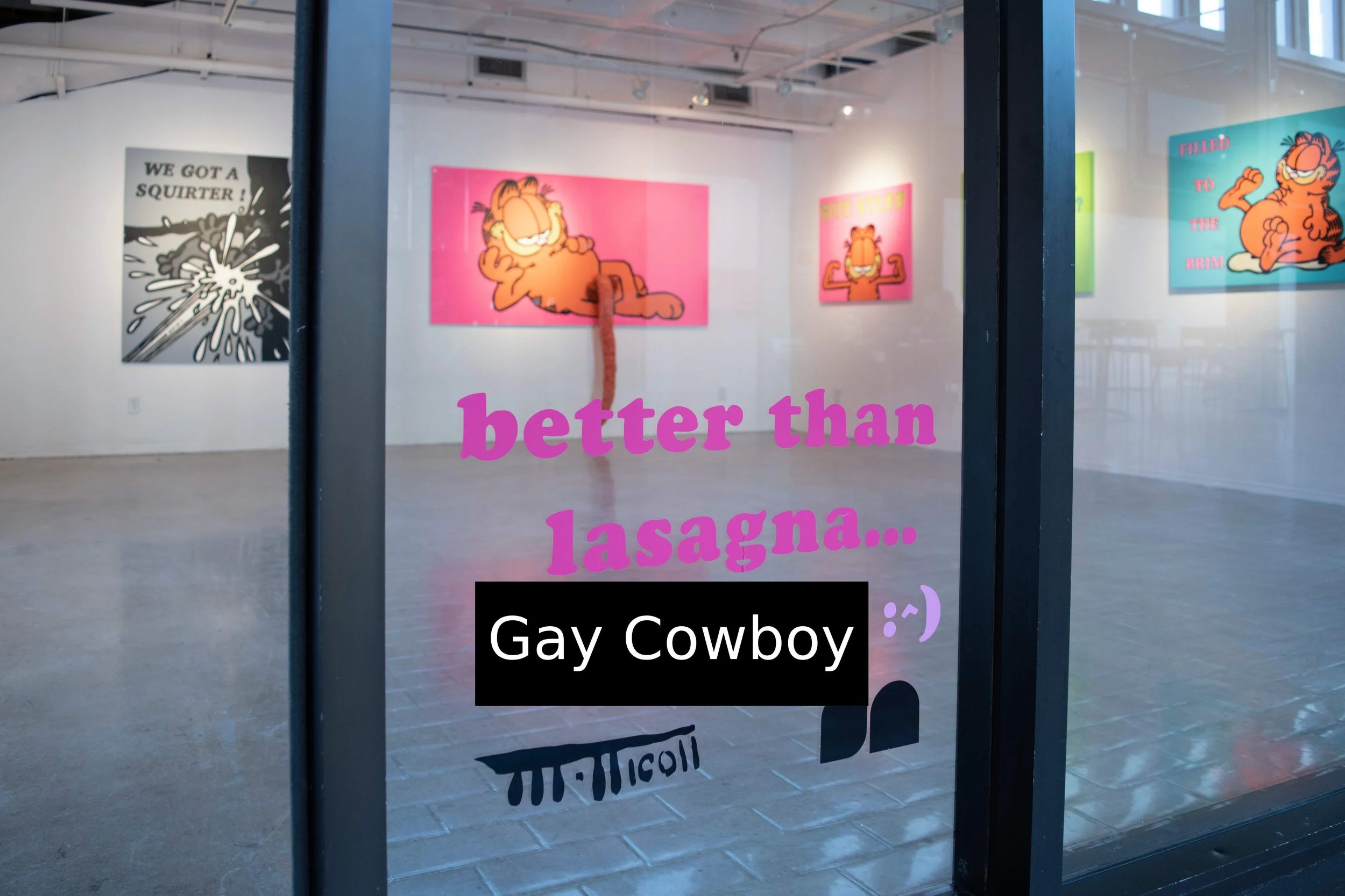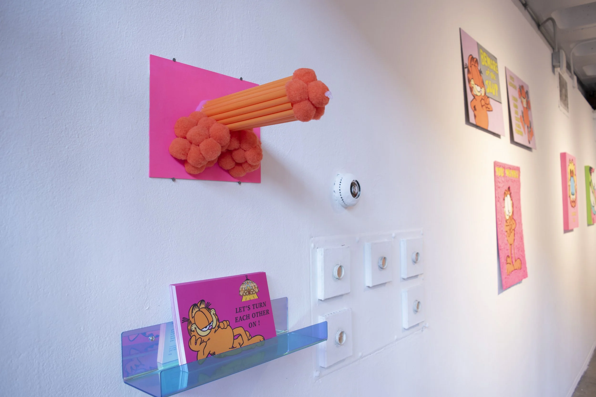 Cowboy’s work as a queer and trans artist originates from a largely conservative city, where he aims to challenge societal norms and explore the relationships between object, process, concept, and context. Through humour and a solitary artistic approach, he reflects on his personal history and cultural identity to create artwork that communicates his experiences and perspectives. At the core of his artistic practice are his Garfield paintings, where he depicts the iconic cartoon character in sexual ways or explores his sexuality in a queer context through the use of text, bright colours, and provocative poses. The inclusion of sculptural elements, particularly in the form of phallic imagery, serves as a blunt confrontation and a rejection of conservative artistic norms. It is important to note that Sam’s work is not about a cisgender man making genitals, but rather a trans man creating a trans dick, reclaiming control over his sexual and gender identity.